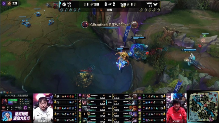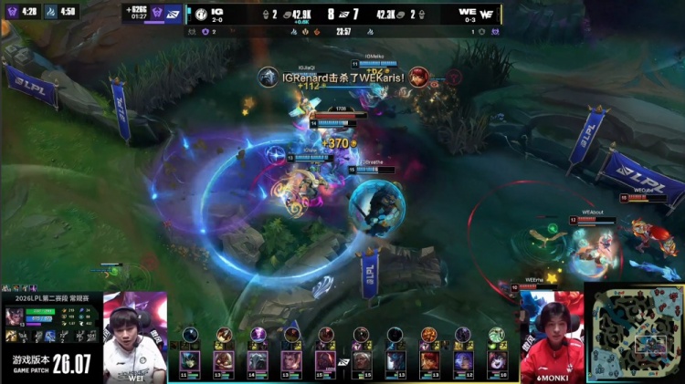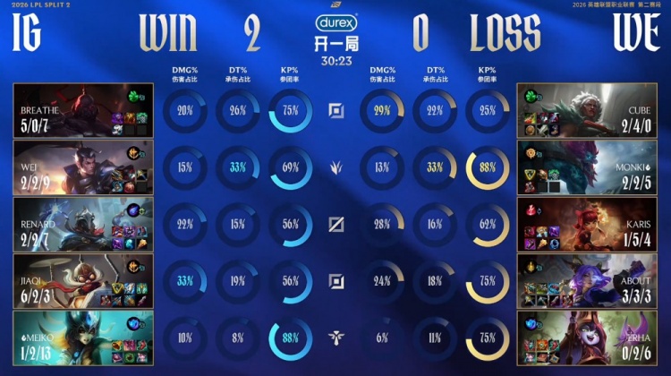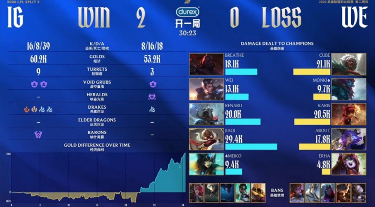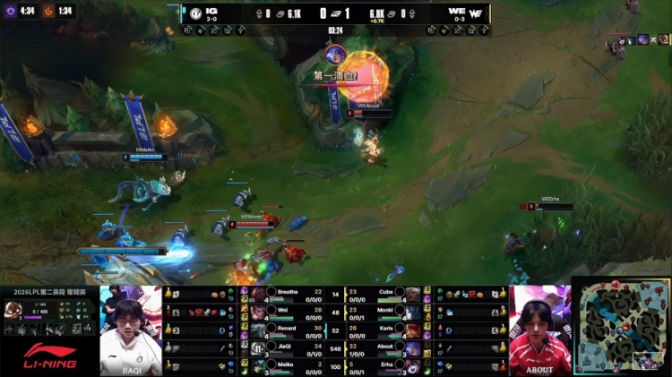 直播吧4月11日讯 2026LPL第二赛段常规赛组内赛继续进行,今日首场比赛iG横扫WE,豪取三连胜!
