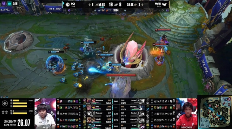 【19:08】WE中路推进拆掉iG一塔,Meiko娜美难逃一死被Monki击杀,WE经济领先1k。