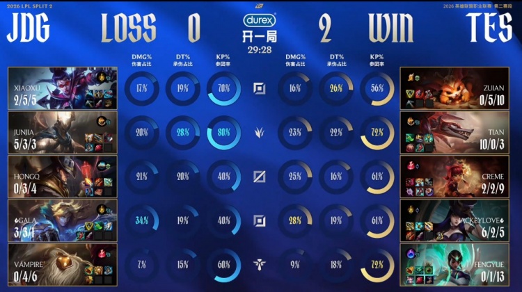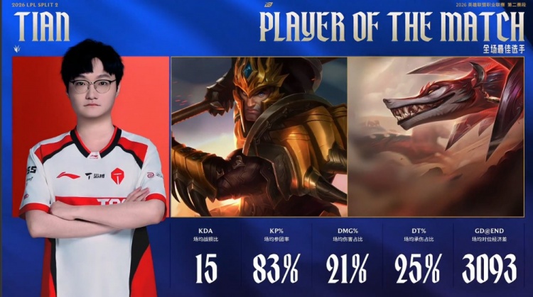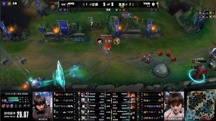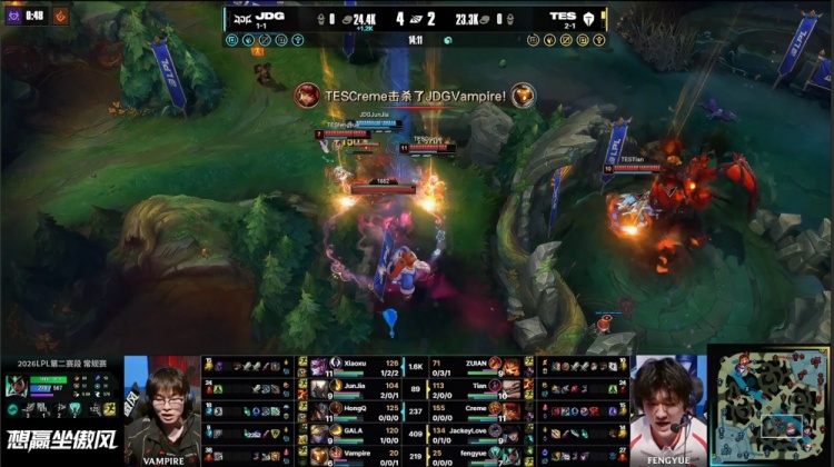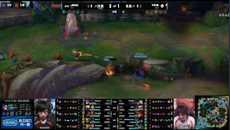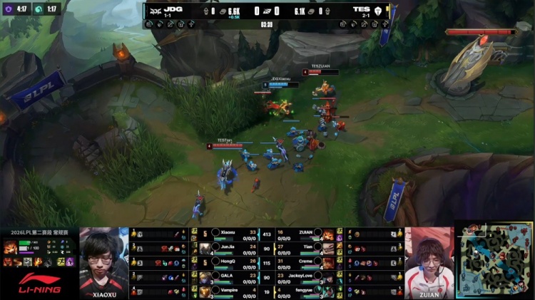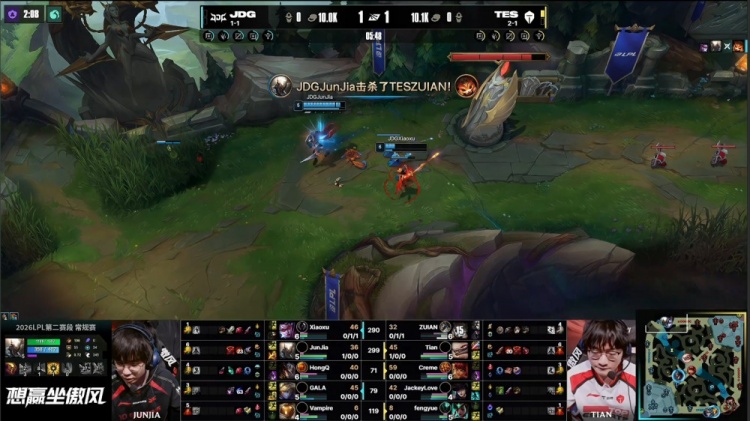 直播吧4月11日讯 2026LPL第二赛段常规赛组内赛继续进行,今日焦点之战TES横扫JDG!