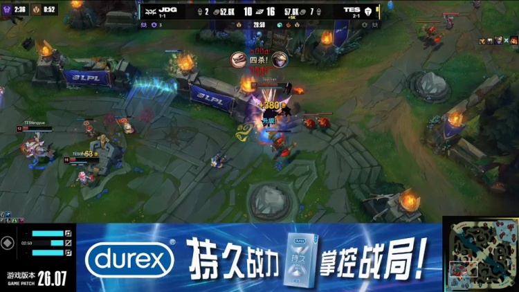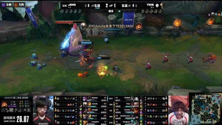 【26:35】TES中路推进,哥哥女警爆头HongQ卡牌,TES顺势推掉JDG中路水晶,经济领先