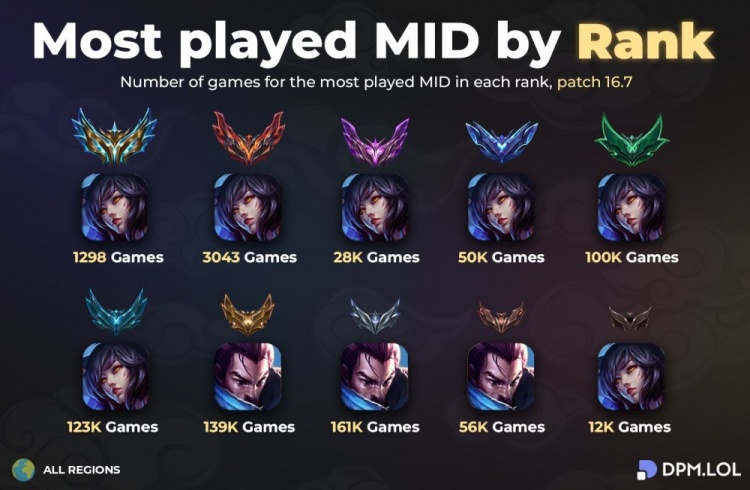 直播吧4月13日讯 数据网站DPM.LOL统计LOL各段位出场率最高的英雄:中单阿狸、亚索,上单杰斯盖伦,打野男枪盲僧佛耶戈剑圣。