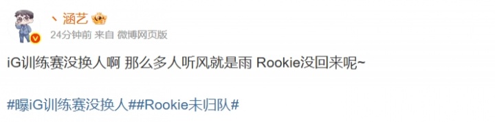 直播吧4月13日讯 今日,涵艺更博辟谣称:iG训练赛没换人啊 那么多人听风就是雨 Rookie没回来呢~!