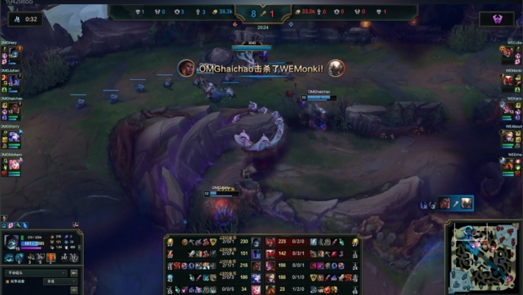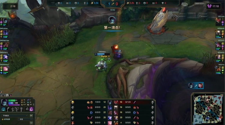 最终OMG下路推进拔掉WE二塔后转中,轻松0换3,一波推平WE基地先下一城。