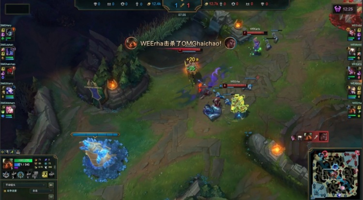 【12:13】河道团战,Juhan梦魇关灯飞脸,Starry艾希击杀与haichao梅尔联手击杀WE下野二人,OMG打出0换2,双方经济持平。