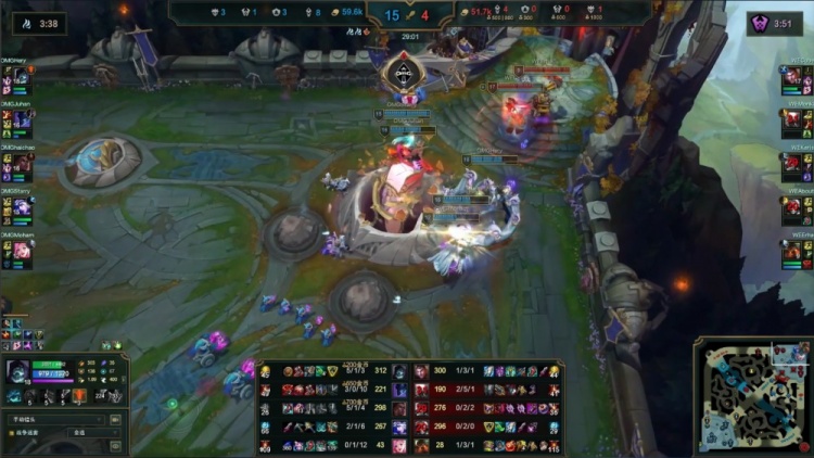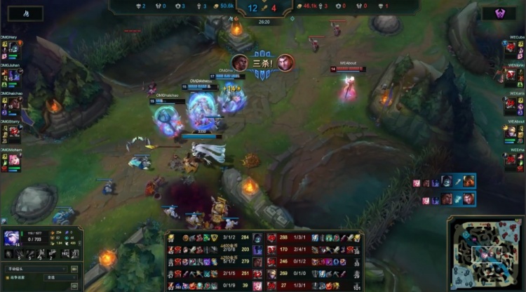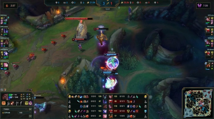 【20:12】Cube杰斯上路又被OMG三人越掉,Monki潘森来救再送一个,战绩来到0-3-1,OMG推掉WE上路一塔,经济领先5k。