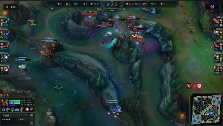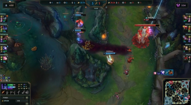 中期河道团战Juhan梦魇关灯,Starry艾希与Haichao梅尔联手击杀WE下野二人,随后小龙团WE野辅阵亡,OMG打出0换2经济领先2k。紧接着Cube杰斯上路被越塔,Monki潘森来救再送一个,OMG推掉WE上路一塔经济领先5k。