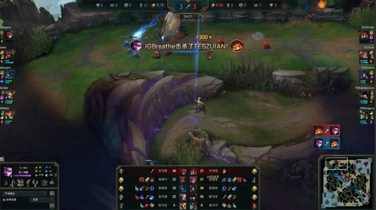 【21:42】iG入侵TES野区,Breathe薇恩瞬间击杀哥哥拿到双杀,iG打出0换3,回头轻松拿到大龙,经济领先1w3k,随后iG轻松一波推平TES基地先下一城。