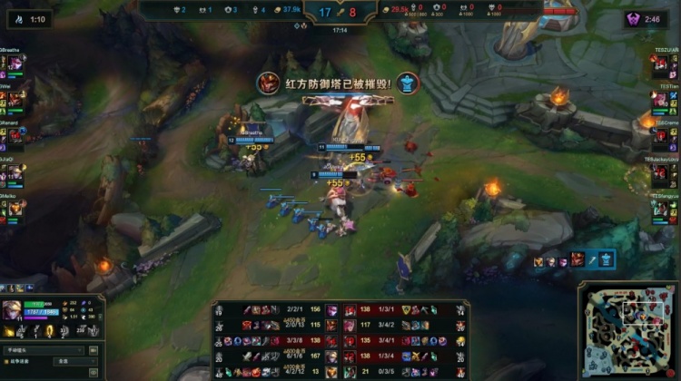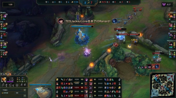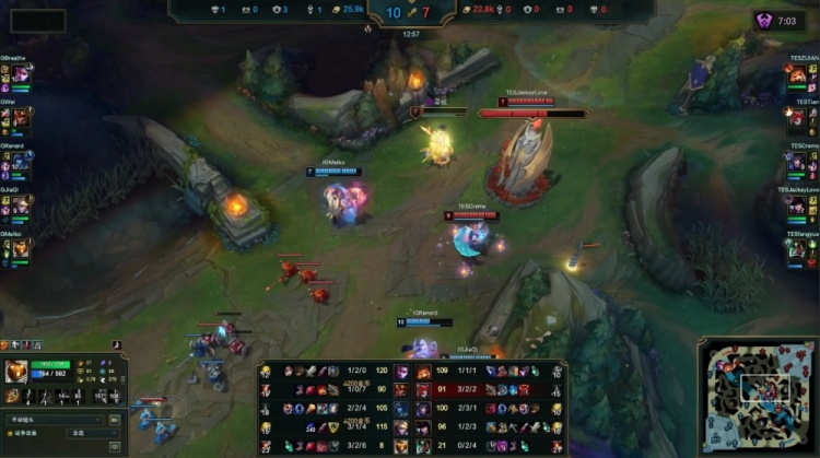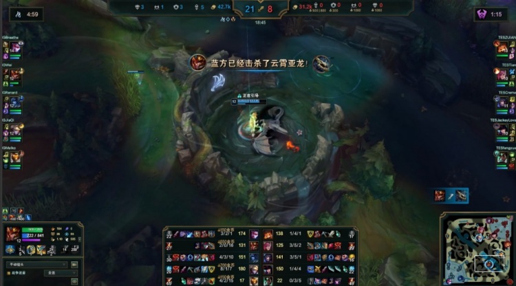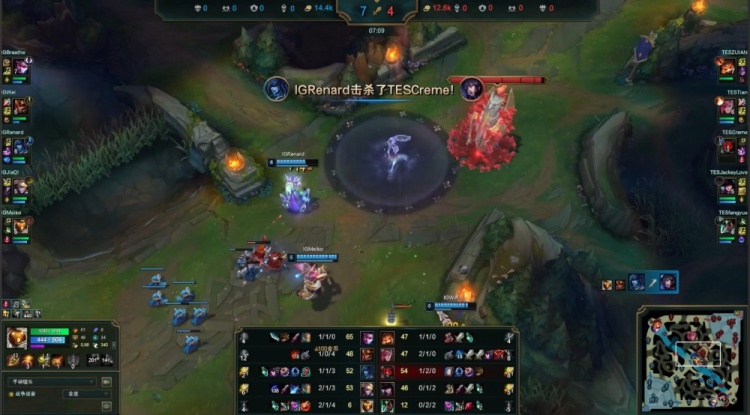 中期iG推掉TES中路一塔,Meiko巴德开门顺势带队进TES野区抓掉小天,紧接着iG打出1换3推掉TES中路二塔经济领先9k。