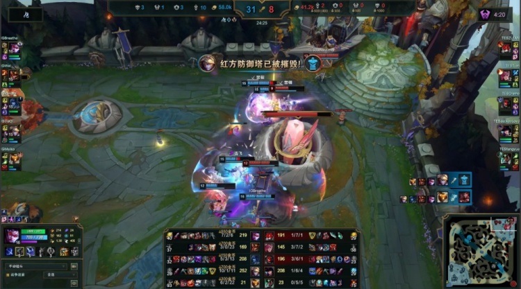 【9:25】小天蔚去上配合ZUIAN大纳尔抓掉交出死亡闪现的Breathe薇恩,中路Creme狐狸研发i3,双方打出1换1。