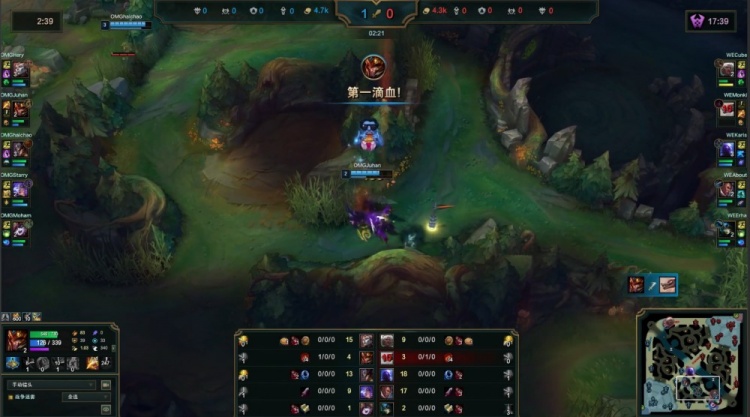 【17:13】野区再战,下路三角草Juhan皇子拉反复拉扯火锅扣掉Karis瑞兹,About卢锡安也没能搭上救护车,中路Monki冥犬强换Starry得手,OMG再打1换4,Hery推掉WE下路一塔,OMG经济领先7k。