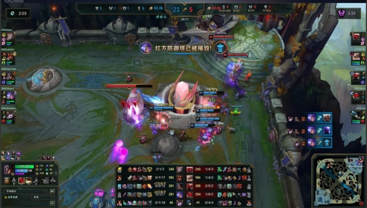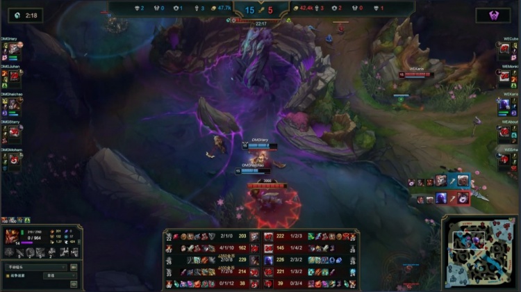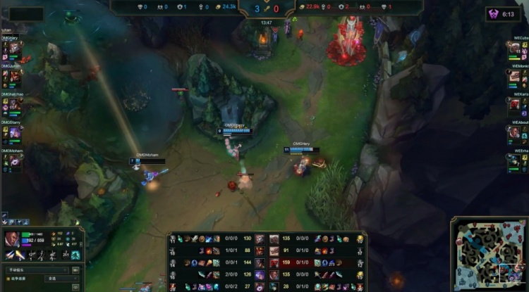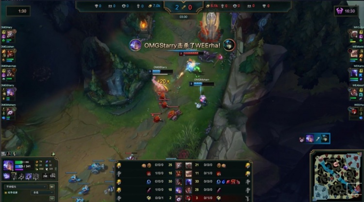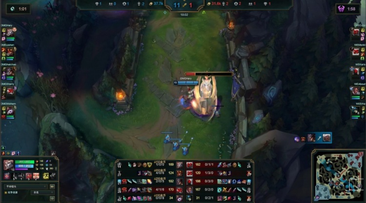 中期河道团战Starry芸阿娜闪现击杀Karis瑞兹,先锋团Monki冥犬拿到先锋但被Hery亚恒戳掉,Haichao卡牌击杀Erha娜美,OMG打出0换4推掉WE中上两路一塔经济领先5k。紧接着野区团战Juhan皇子火锅扣掉Karis瑞兹,About卢锡安也被击杀,OMG再打出1换4推掉WE下路一塔经济领先7k。