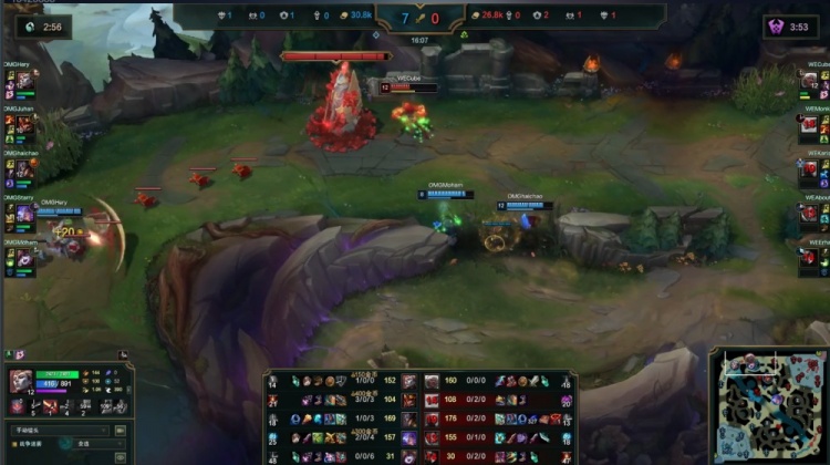 【20:22】下路混战,Monki冥犬锁头Hery亚恒配合Cube安蓓萨强杀得手,WE推掉OMG下路一塔,经济落后6k。