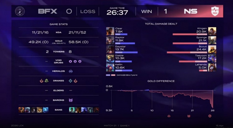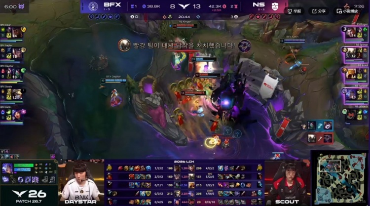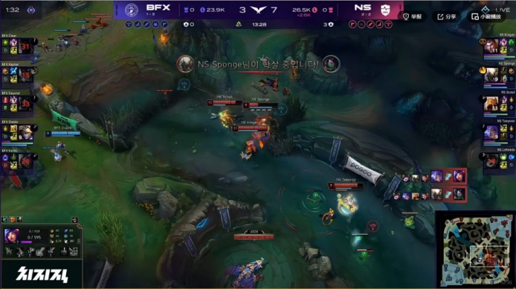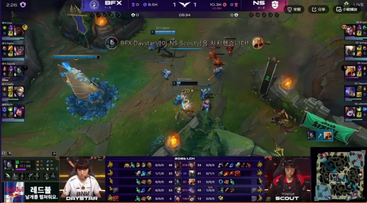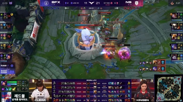 26分钟Clear奎桑提TP落地被强开,Raptor赵信扫大+Kellin妮蔻大招进场但是伤害完全不够啊!Taeyoon芸阿娜开大输出+Scout沙皇一推直接结束团战!最终Sponge潘森大招冲上高地强杀Diable伊泽瑞尔,NS完成对BFX的团灭,中路顺势一波结束掉首局比赛!