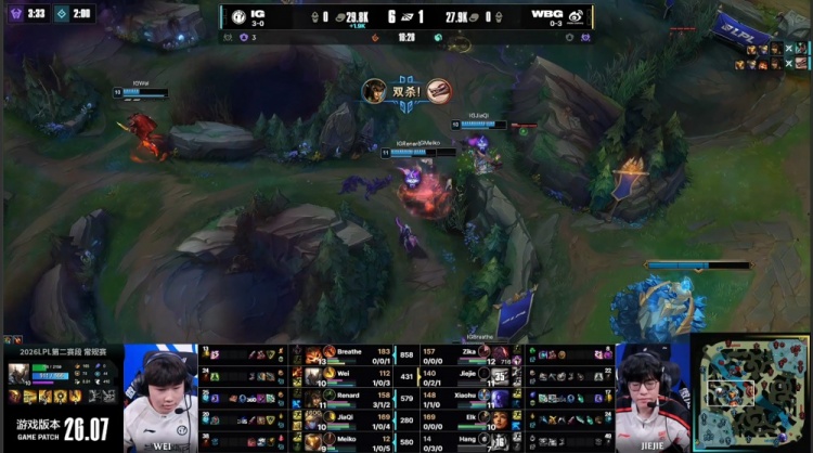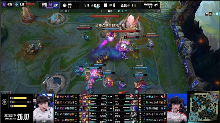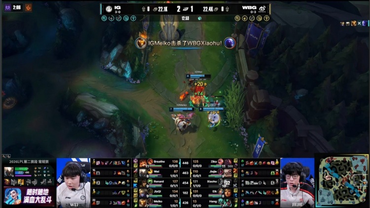 中期小龙团,Meiko巴德隔墙Q住WBG野辅将其留下击杀。先锋团Renard蛇女闪现R双杀WBG野辅,随后Breathe大纳尔下路单杀Xiaohu瑞兹。JiaQi随后走位失误被Xiaohu瑞兹控住击杀,WBG打出1换2双方经济持平。