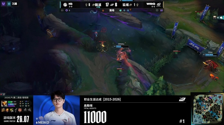 【13:30】小龙团,Meiko巴德隔墙Q中WBG两人,WBG野辅瞬间阵亡,iG打出0换2,本局为电龙魂。