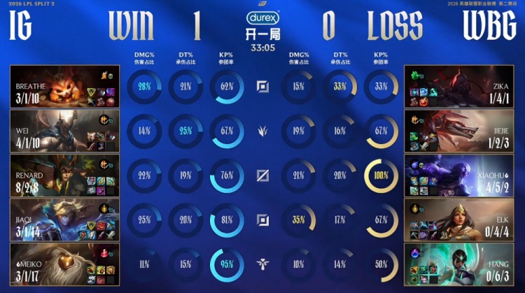 【16:05】先锋团,Jiejie冥犬吃掉先锋,Breathe纳尔TP落地,Renard蛇女闪现R定WBG两人,Renard击杀WBG野辅拿到双杀,iG打出0换2。随后Breathe大纳尔下路单杀xiaohu瑞兹。