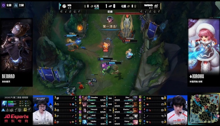 第二局前期Wei赵信三级抓下拿到Elk一血。下路2V2,Meiko冰鸟封墙配合JiaQi双杀WBG双人组,Xiaohu安妮两度去上逮捕Breathe杰斯。