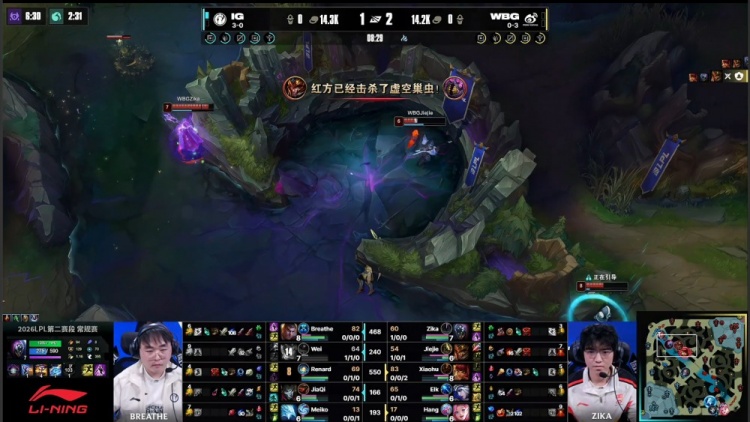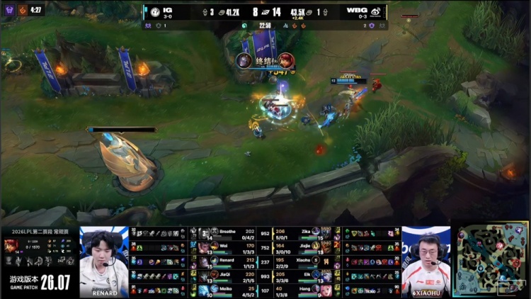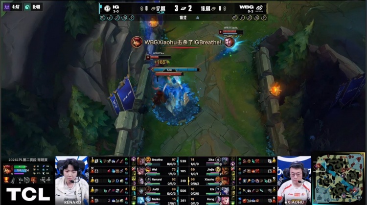 中期小龙团Renard发条拉回Xiaohu安妮,JiaQi烬将其击杀,iG打出0换2。随后iG再进WBG下野区,Zika贾克斯进场爆轰三杀,WBG打出0换3,双方经济持平。