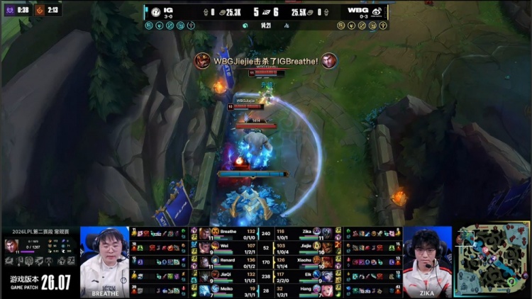 【20:35】iG入侵WBG下野区,Jiejie皇子EQ击飞Wei,Meiko冰鸟残血与Breathe被包夹,Zika贾克斯进场爆轰三杀,Breathe杰斯0-3-2,WBG打出0换3,双方经济持平。