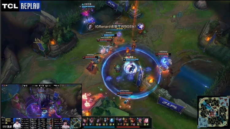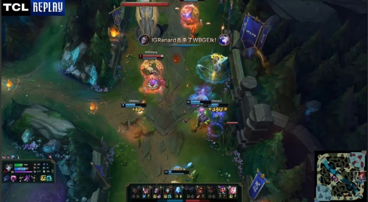 【22:53】Xiaohu安妮下路推线过深被iG中野逮捕送Renard终结人头。