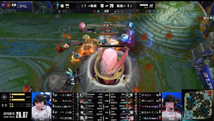 【11:52】河道团战,hang萨勒芬妮大iG两人,Jiejie皇子火锅跟上,Wei赵信被hang萨勒芬妮死前击杀,Meiko冰鸟变蛋起身被Elk击杀,WBG打出2换3。