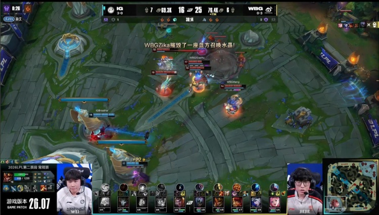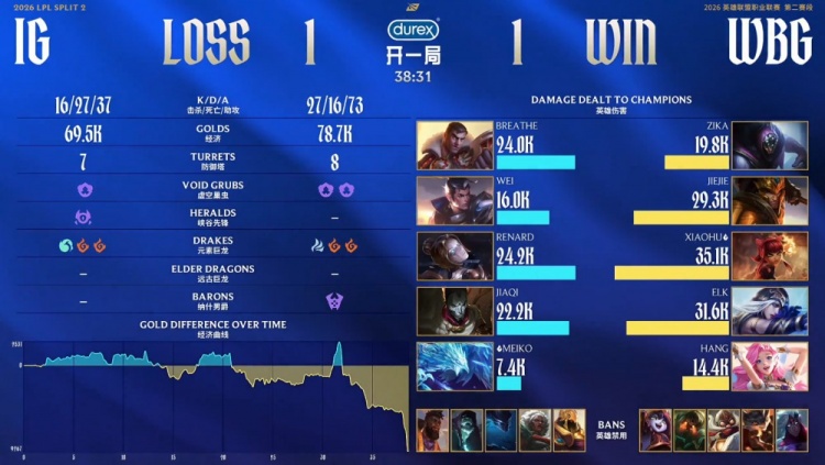 后期中路团战双方持续拉扯,Wei赵信捅飞Elk艾希,Breathe杰斯融化Xiaohu安妮,iG四人冲上WBG高地,Wei赵信差一下未能点爆WBG基地。终极中路团战,Zika贾克斯无敌绕后配合队友正面开团,WBG打出0换3,一波推平iG基地扳回一城。