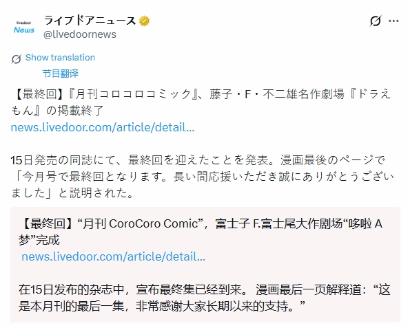 据悉,本次完结的是《藤子·F·不二雄名作剧场 哆啦A梦》再连载栏目,并非《哆啦A梦》原作漫画——后者早在1996年藤子·F·不二雄逝世后便已停止原创连载,其未完成的大长篇《大雄的发条都市冒险记》由藤子·F·不二雄制作公司根据草稿接续完成。多年来,杂志一直以名作剧场的形式,对《哆啦A梦》相关内容进行再连载,延续着这一国民IP的温暖陪伴。
