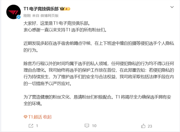 为了营造健康的粉丝文化,恳请粉丝们积极配合。T1将竭尽全力确保选手拥有安全的环境。”