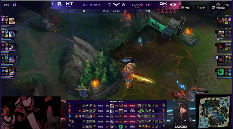 【44:30】中路团战Lucid安蓓萨想找纳亚菲利未果,自己先被打出复活甲,厄斐琉斯+维鲁斯双大全空!起身想捡灯笼走但是吃到Effort璐璐变羊,被Aiming芸阿娜两发带走!侧翼Bdd阿狸留住SMK卡牌,DK阵型完全被冲散,KT打出0换4,从中路一波结束比赛!拿下五连胜!仍然是LCK本赛段唯一不败的战队!