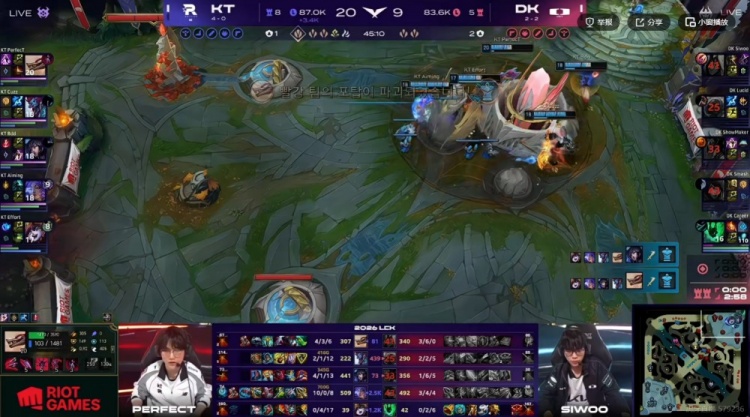 【10:25】KT拿下第一条小龙,DK三人包上越塔强杀PerfecT纳亚菲利!