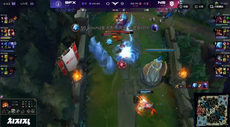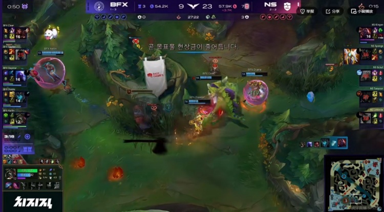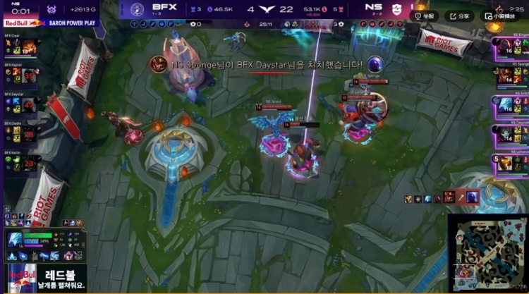 24分钟,Diable卡莉斯塔大招扔出Kellin烈娜塔想找没闪的Taeyoon烬,但是Kellin烈娜塔一个反向大招直接让BFX的攻势化为乌有了!NS反打逐个击破打出0换4,拆掉中路高地!快8K经济差了!