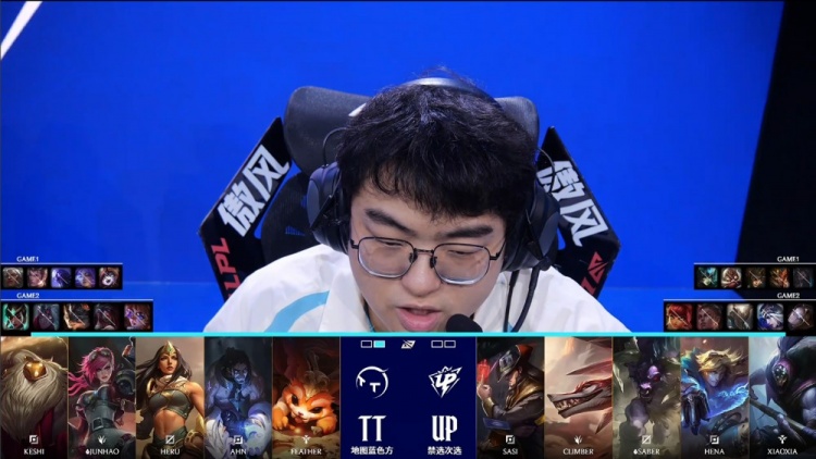 第二局前期climber冥犬入侵TT野区赶走Junhao蔚后,3级抓上与Keshi纳尔互换。TT上野区混战,climber冥犬被Keshi支援到场击杀,xiaoxia牛头被Heru萨拉斯追击致死。龙坑之上Junhao蔚与队友脱节,Climber冥犬锁头双杀,UP打出0换2。