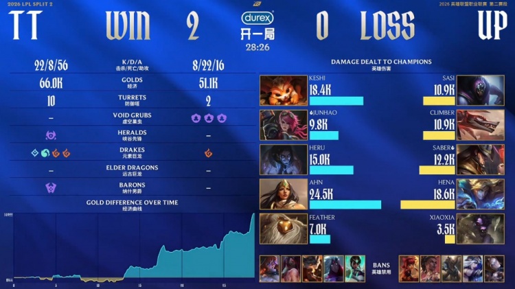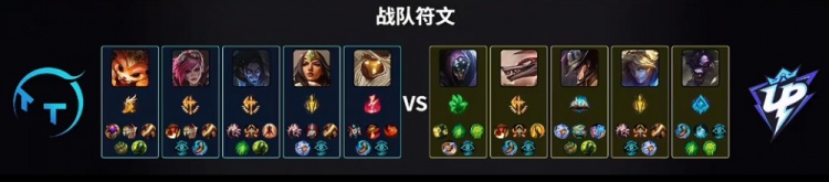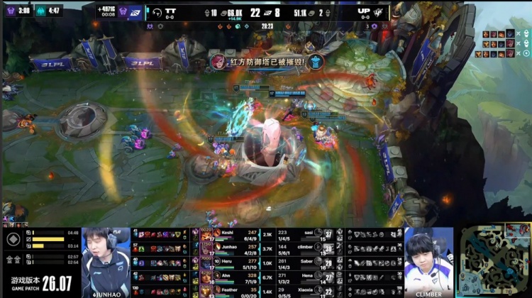 中期UP下路四越三,Feather巴德金UP两人,Junhao蔚爆轰双杀,TT打出0换4,经济反超2k。小龙团,xiaoxia牛头开大难逃一死,Junhao蔚锁头进场,Ahn火力全开爆轰三杀,TT打出0换5推掉UP中路一塔,经济领先6k。