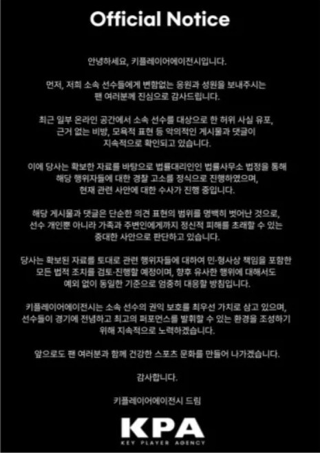 感知到事态严重性的Oner经纪公司KPA,于4月7日宣布通过法律代理人正式向警方提起了针对恶意评论者的诉讼。KPA方面警告称:“判断相关帖子和评论已明确超出单纯表达意见的范畴,给选手及其家人造成了重大的精神伤害,今后对于类似行为将无一例外追究民事及刑事责任。”