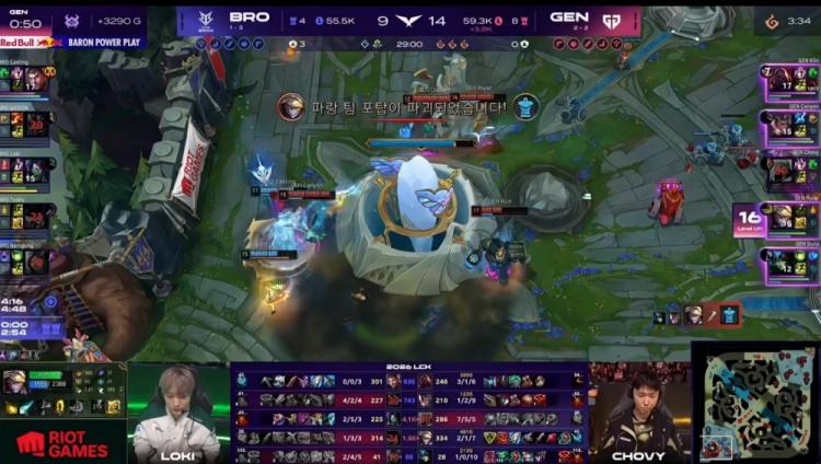 中期先锋团,双方中野2换2,BRO拿到先锋撞掉GEN中路一塔,经济领先4k。小龙团Loki阿卡丽TP绕后被Duro娜美拖住进场时机,GEN正面打出1换3,经济劣势回到2.5k。随后Chovy沙皇带队下路越塔再换掉Loki,loki连续阵亡研发i5,GEN逐渐缩小经济劣势至1k。
