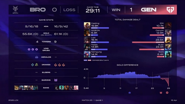 后期GEN吃掉大龙中路推进,Chovy沙皇轻松戳到双杀,GEN听牌火龙魂,经济反超1k。最终GEN下路平推BRO基地先下一城。