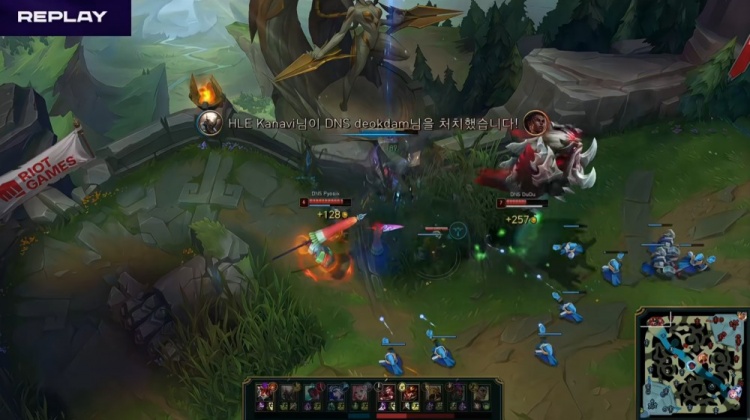 【17:55】HLE下路放出先锋推进,小吕布点掉pyosik皇子,但HLE野辅被换,DNS打出1换2,HLE经济领先700块。