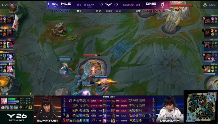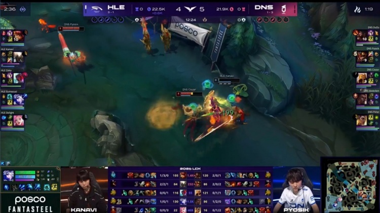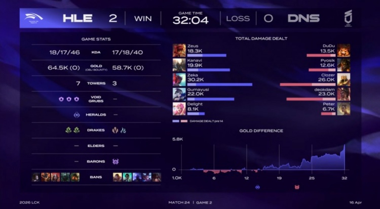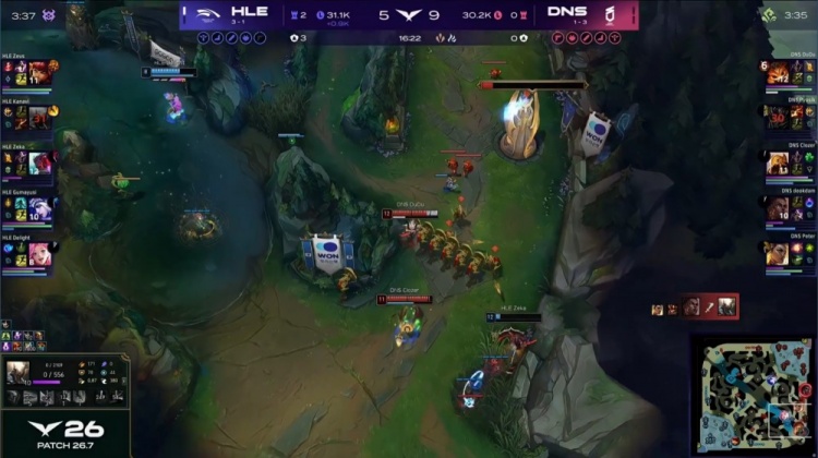 第二局前期双方围绕上路与野区频繁爆发冲突,人头互有交换,DNS在对线期通过抓单与小规模团战一度占据主动,但HLE始终紧咬经济,没有被拉开差距。
