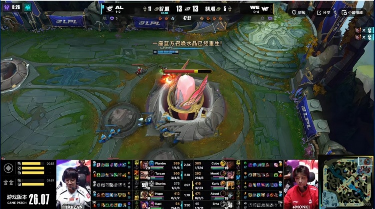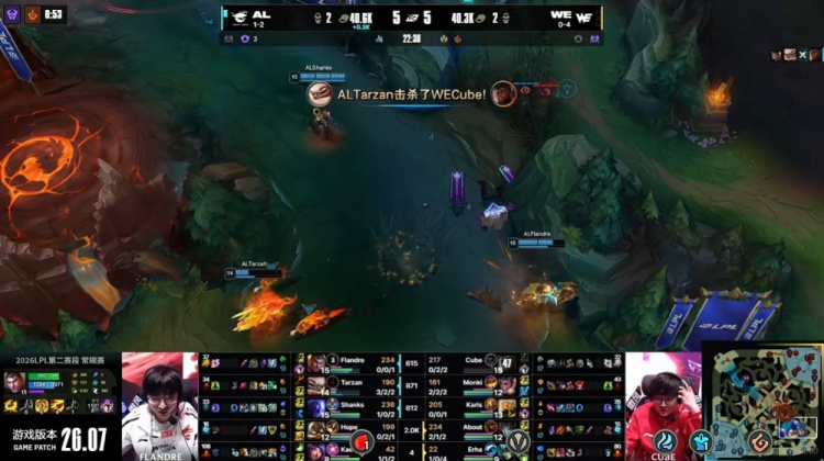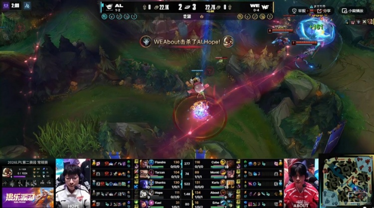 【12:58】AL拿下小龙,但是下方落单的Hope库奇直接被WE开到,About烬开大完成击杀!随后AL四人开团还被Erha娜美水泡命中两个,kael妮蔻还被迫交了个撤退闪!随后Karis沙皇+Cube奎桑提两人还拆掉了AL的上一塔!WE经济反超!