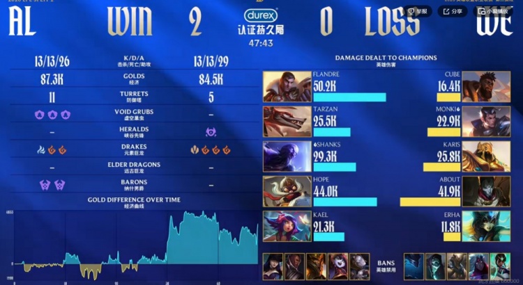 比赛进入后期,WE拿下火龙魂,AL则是牺牲Tarzan纳亚菲利再拿一个大龙!但是此时WE决策有点激进,想一波但是对手有大龙BUFF完全没法一波,自己的上路兵线持续没人管还成了伏笔!双方连续拉扯中没人管的上路兵线拆掉了WE的上路高地!Shanks瑞兹也带线给足WE压力!最终远古龙团Shanks瑞兹绕后被开白给,但是Flandre杰斯带着兵线直接交出TP偷家成功结束比赛!AL结束自己连败的同时,送给WE赛段的五连败!