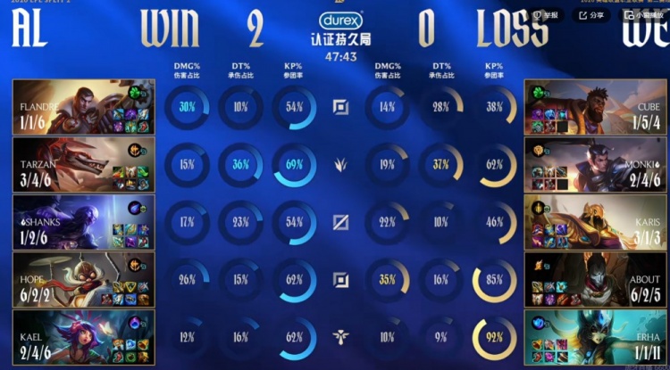 AL:上单Flandre,打野Tarzan,中路Shanks,下路Hope,辅助kael