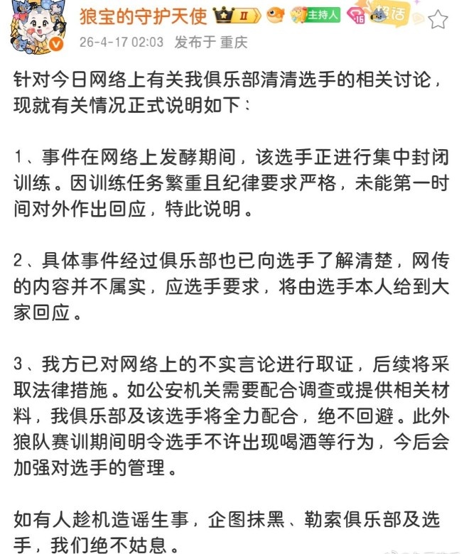 在清清更新社媒澄清后,狼队官方运营发文回应:
