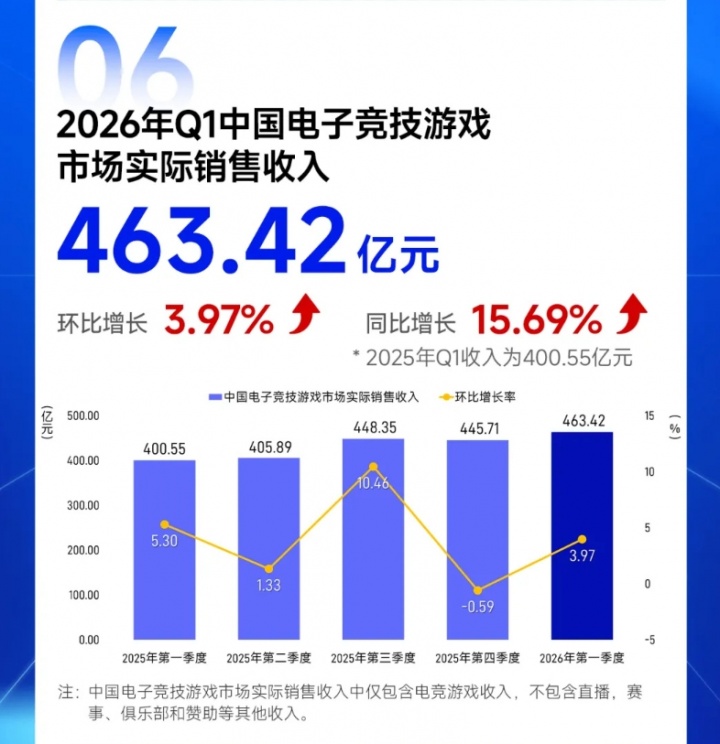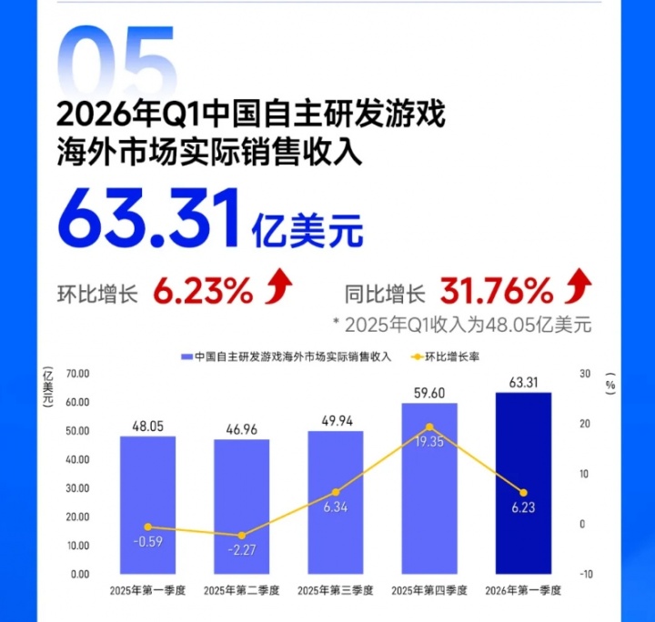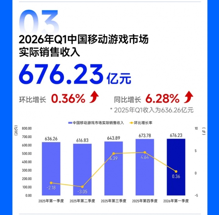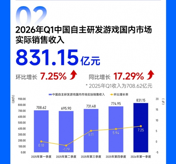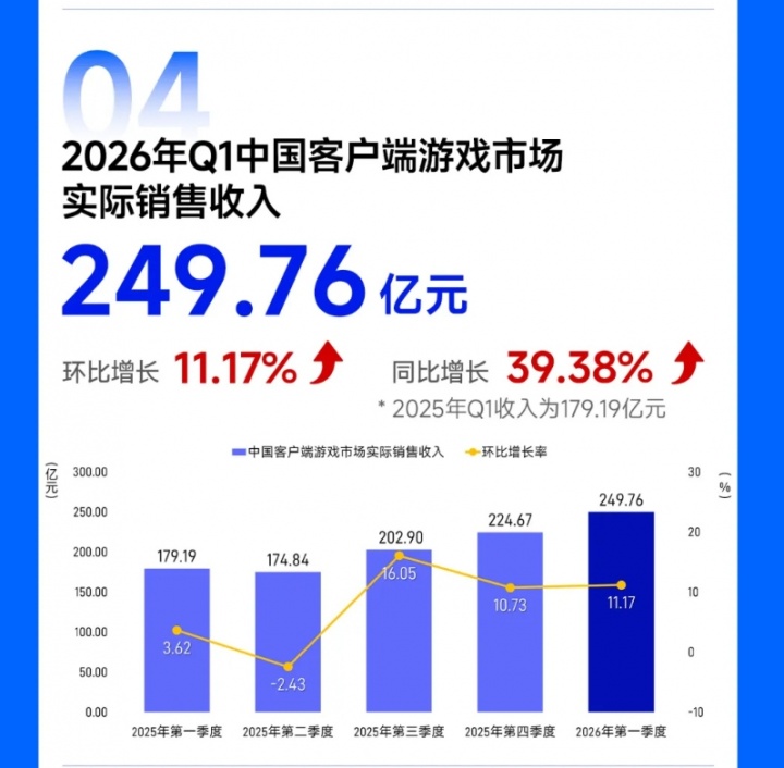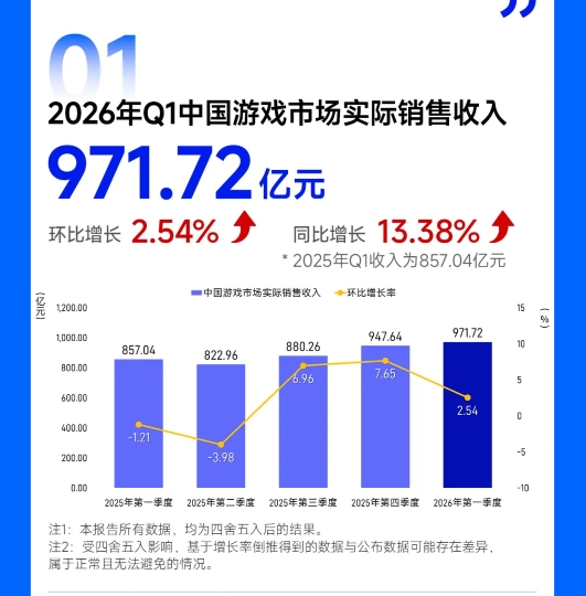 直播吧04月17日讯 中国音数协游戏工委今日发布《2026年第一季度中国游戏产业季度报告》,报告显示:2026 年第一季度中国游戏市场实际销售收入 971.72 亿元,环比增长 2.54%,同比增长 13.38%,其中,中国移动游戏市场实际销售收入 676.23 亿元,环比增长 0.36%,同比增长 6.28%,中国客户端游戏市场实际销售收入 249.76 亿元,环比增长 11.17%,同比增长 39.38%。中国自主研发游戏海外市场实际销售收入 63.31 亿美元,环比增长 6.23%,同比增长 31.76%。