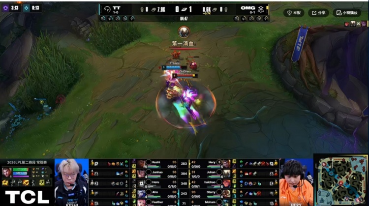 第二局比赛4分钟OMG中野合作击杀Heru阿萝拉让Juhan潘森拿下一血!不过同时TT下路三人越塔强杀掉了Starry库奇!