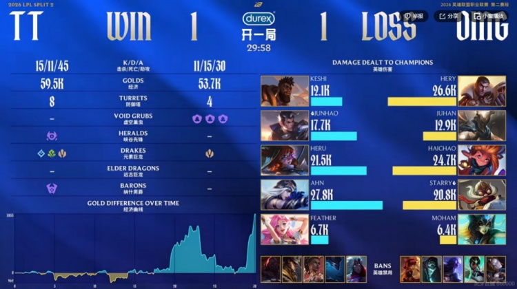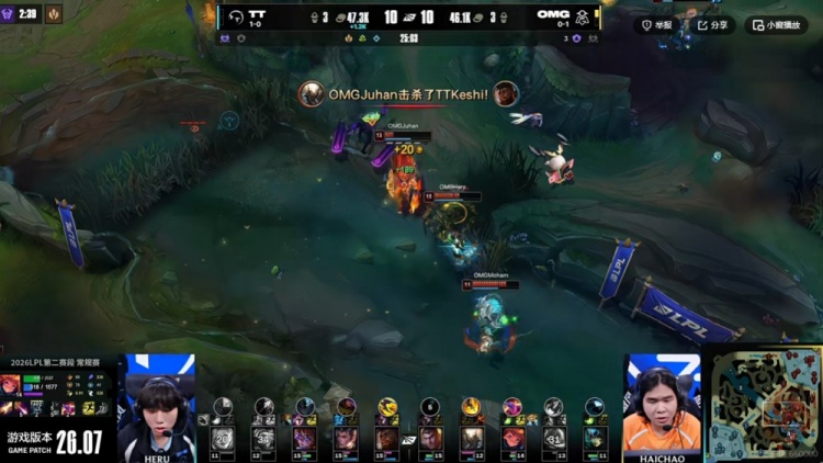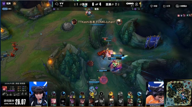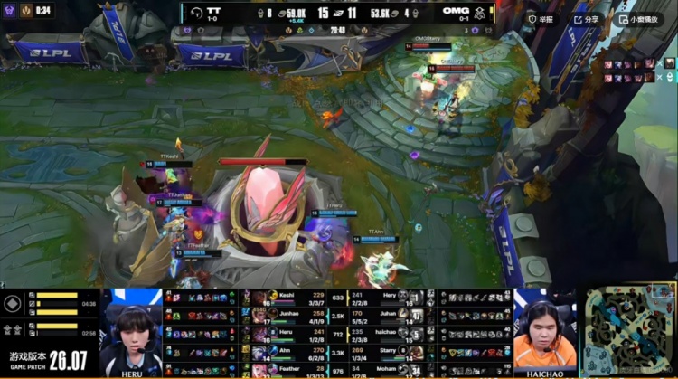 23分钟TT推下但是Keshi奎桑提吃不住伤害啊!TT换掉Juhan潘森但是Heru阿萝拉进场吃了水泡之后抗塔白给了!OMG追击强行留住Ahn艾希,还了一波1换4!25分钟龙魂团,haichao佐伊连续睡眠气泡命中,OMG又是一波1换3之后拿下第四条小龙!没让TT拿到土龙魂!两队的5K经济差被抹平了!