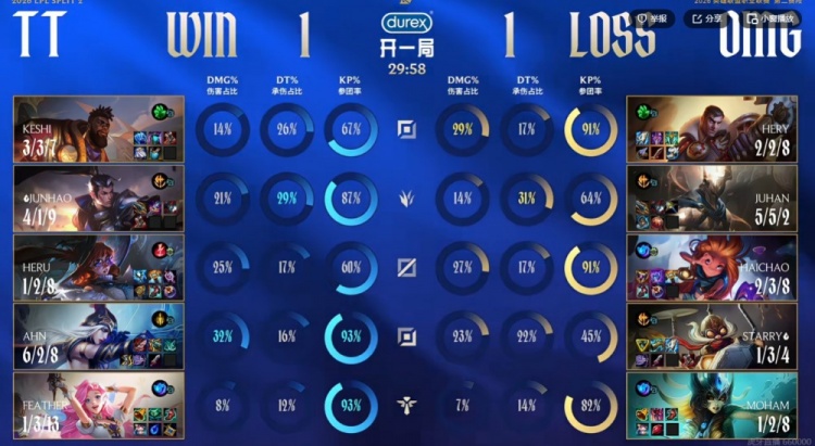 第一局:🎮TT毫无节奏纯在挨打!Juhan斯卡纳横行无阻 OMG平推赢下首局
