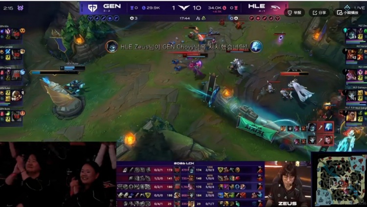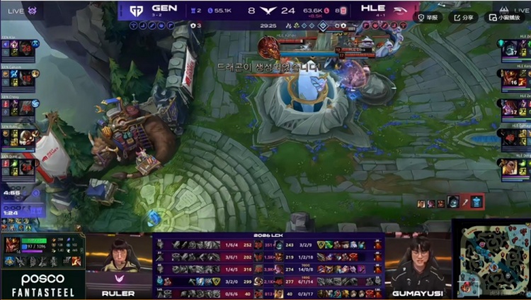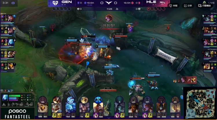 【27:18】HLE开大龙,但是留人的Delight芮尔和救人的Kanavi皇子双双白给!GEN打出2换3,但是Duro巴德追击被Gumayusi烬两枪点死!Zeka阿萝拉交出TP逼GEN回防,第二波大龙团HLE直接强秒Canyon赵信,没有前排的GEN阵容直接溃败了!HLE打出1换4结束比赛,先拿一分!