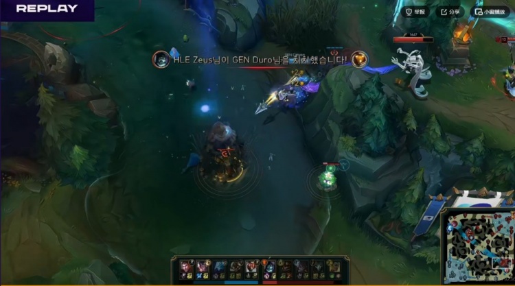 【15:28】GEN下路想抓Zeus约里克,但是Duro巴德大招命中之后贴脸Q空了!自己还被Zeus约里克的小鬼黏死了!HLE同步拿下了先锋!