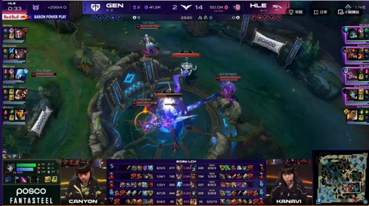 【13:20】GEN三人下路越塔失败,结果被Delight芮尔反蹲吸两个被迫撤退,Zeka阿萝拉罩大留人,GEN野辅白给!HLE这波0换2过后已经拿下2K优势!