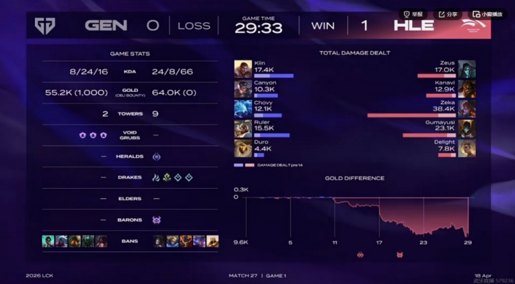 首局双方开局平稳发育,HLE第一波借助Delight芮尔开团打出1换2,随后GEN连续越下失误,让Zeus约里克抗压的同时HLE随便拿资源啊!17分钟Kanavi皇子中路被开但是游龙,HLE一波0换4拉开经济差之后连续gank扩大优势!无伤拿下大龙+海克斯龙魂!拆掉GEN两路高地胜局已定!虽然GEN在二大龙团第一波强行打出3换3,但是第二波自己唯一的前排Canyon赵信被强秒之后直接溃败,HLE一波1换4之后结束比赛,先拿一分!